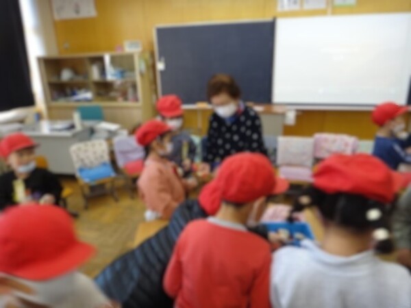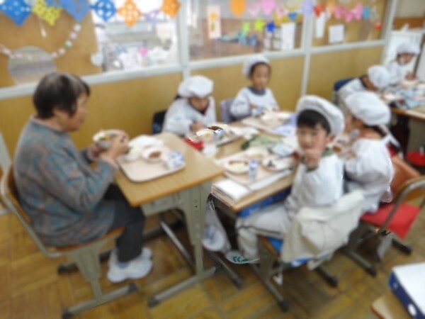 昔遊びの後は、みなさんと一緒に給食を食べました。「おいしいね。」「またきてほしいいな。」などと話しながら楽しそうに食べていました。