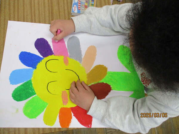 3月5日図工で「ようこそあたらしい1ねんせい」で花の絵をクレヨンで描きました。