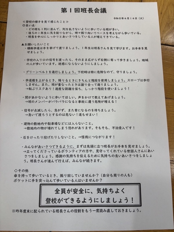 日頃、班長さんがきちんと班員を学校まで連れてきてくれるおかげで事故・ケガなく安全に登校ができています。また、代表世話人の保護者の皆様をはじめ、地域の皆様にも温かく見守っていただいております。ありがとうございます。