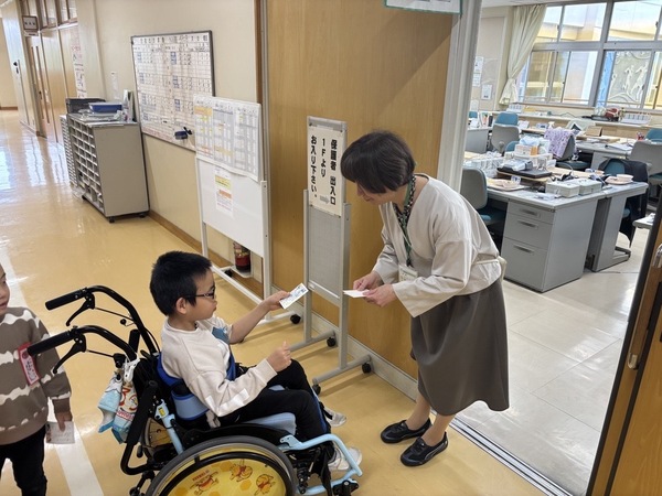 4/23 4時間目は学校で5組の皆さんがかかわる先生方へ名刺を渡しに行きました。目と目を合わせて、あいさつをして、上手に名刺を渡す姿が見られました。