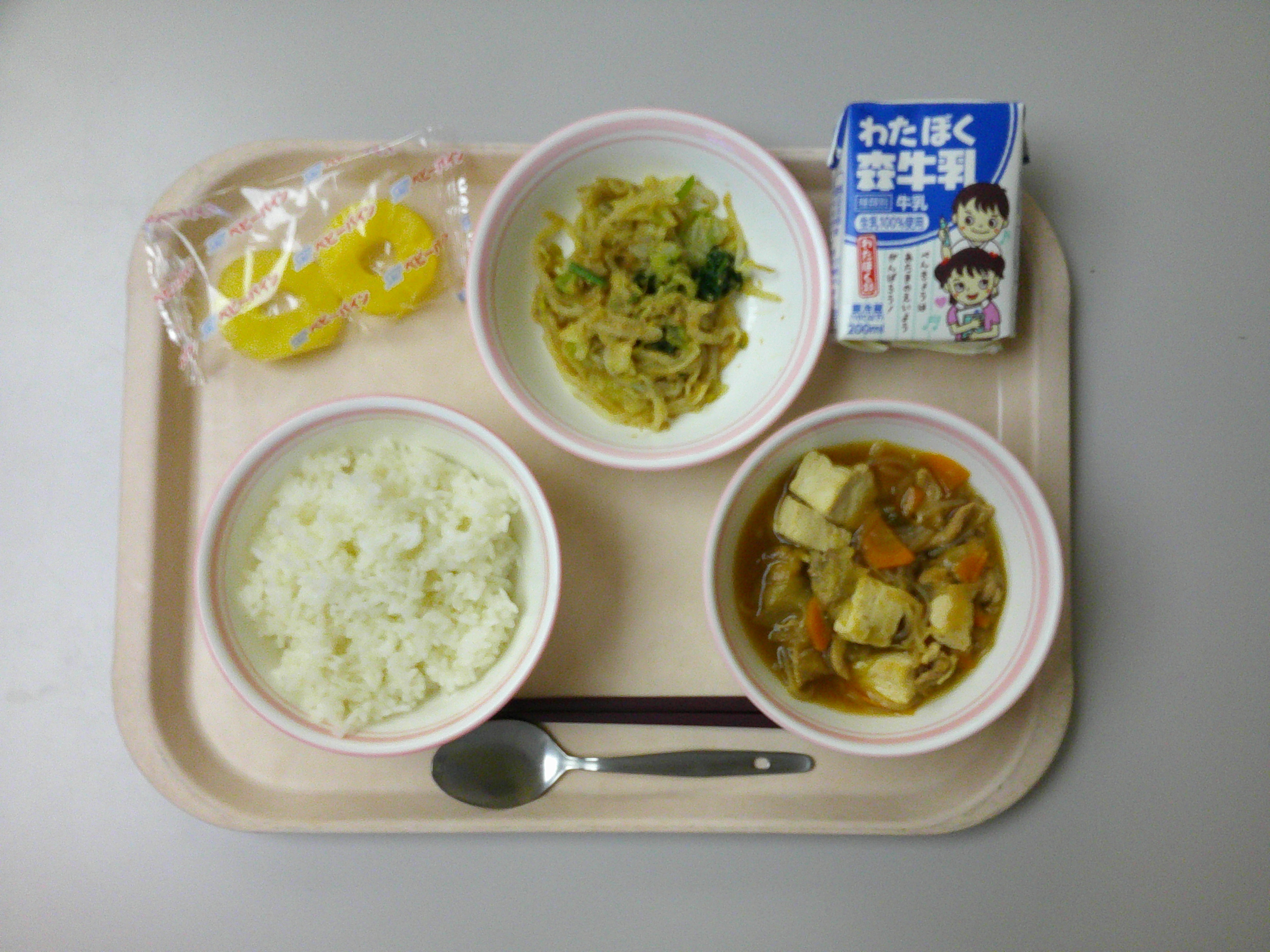 ・ごはん ・にくどうふ ・ごまあえ ・れいとうパイン ・牛乳