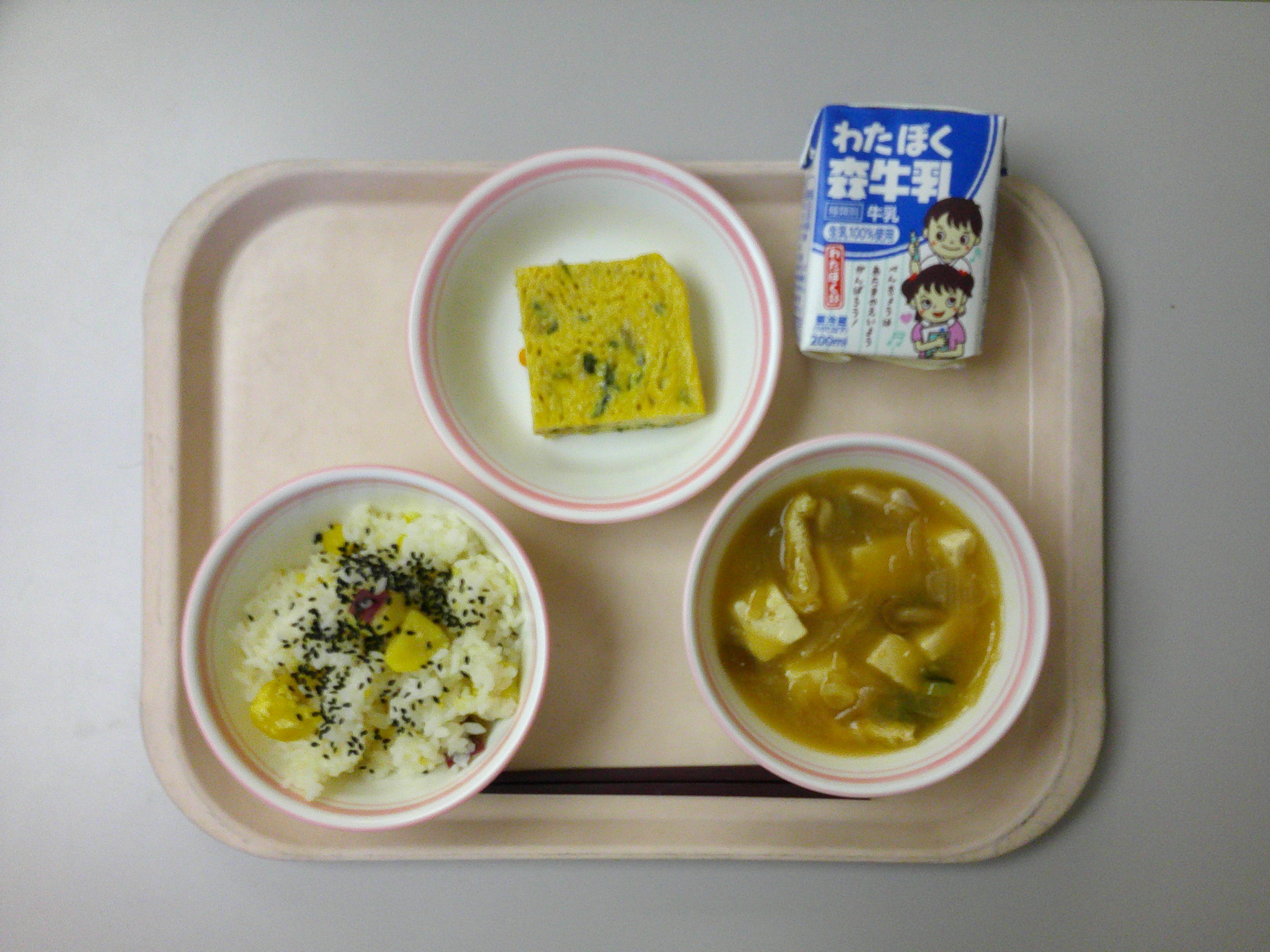 ・さつまいもとくりのごはん ・ちぐさやき ・なめこじる ・牛乳