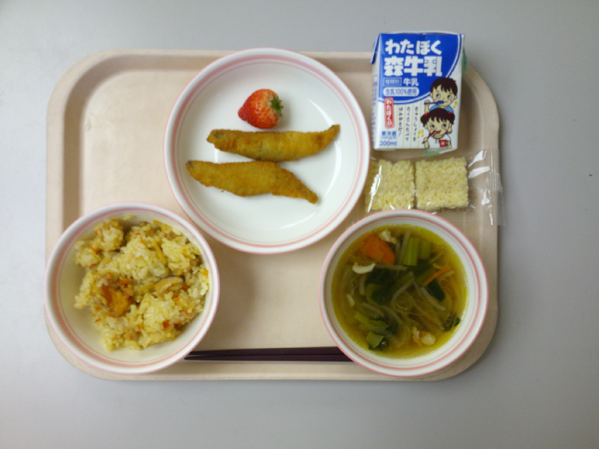 ・ちゅうかふうまぜごはん ・ししゃもフライ ・おこげのスープ ・いちご ・牛乳