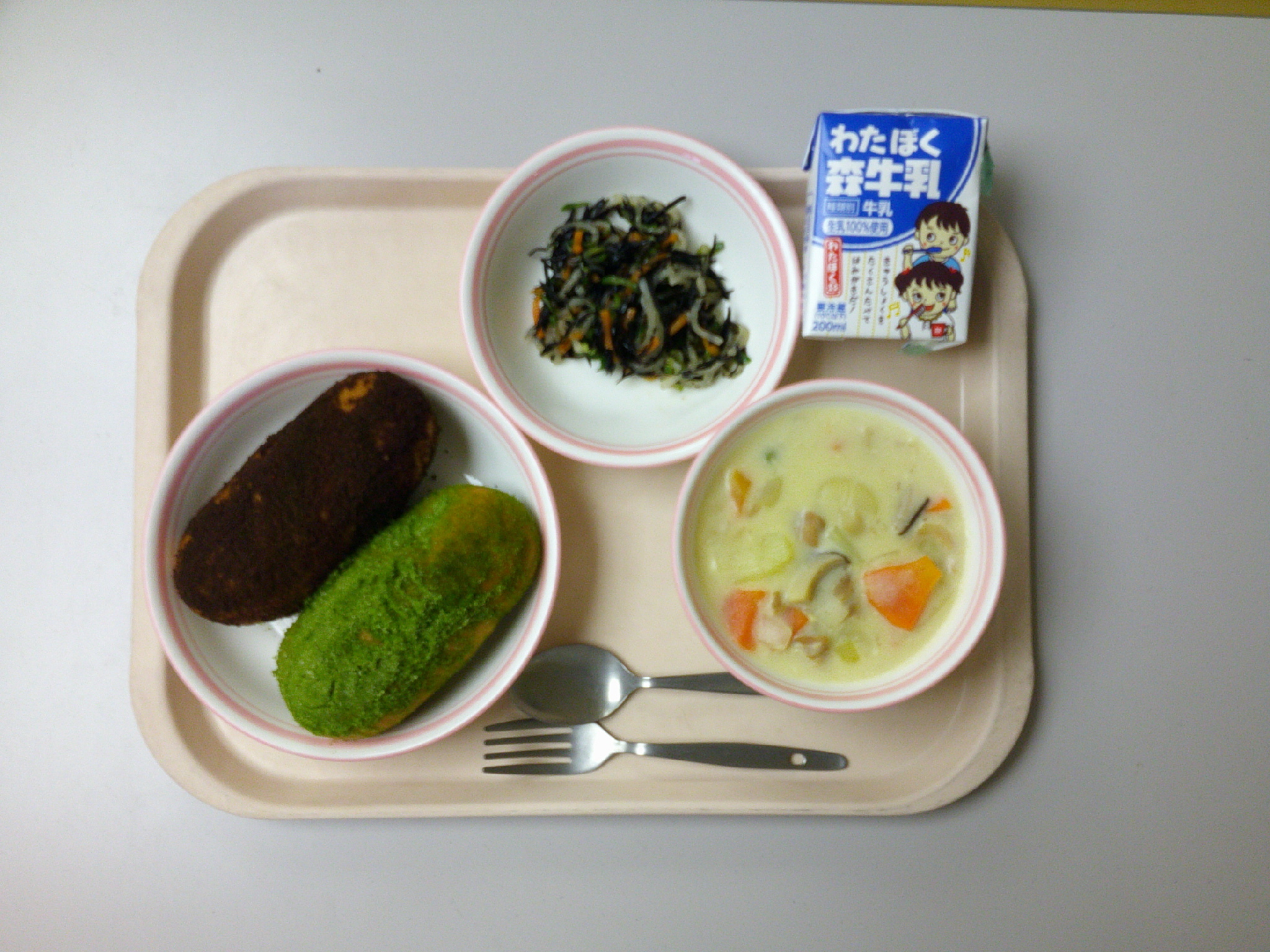 ・にしょくあげパン(ココア・まっちゃコッペパン) ・クリームシチュー ・ひじきのマリネ ・牛乳