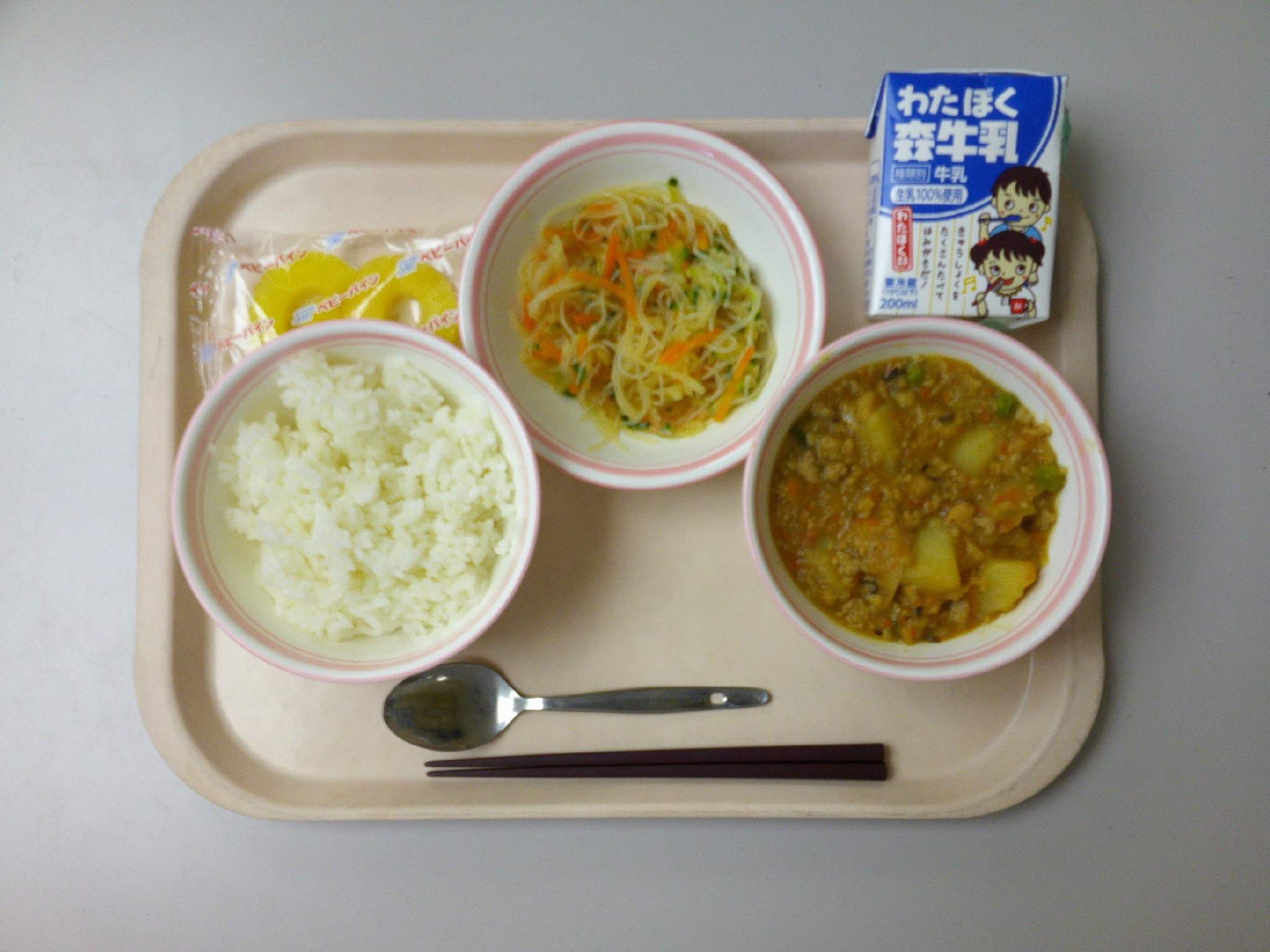 ・ごはん ・じゃがマーボー ・はるさめとくらげのサラダ ・パインアップル ・牛乳